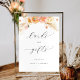 Placa personalizada elegante de casamento "Cartões e Presentes" com um detalhe floral em aquarela requintado em uma bela mistura de tons de pêssego, creme e rosa, e detalhes de caligrafia moderna à mão. A placa está disponível em uma variedade de tamanhos. Coleção com produtos coordenados disponível!