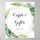 Este cartão de destino geométrico e sinal de presente é perfeito para um casamento tropical ou chá de noiva. O design apresenta folhas de palmeira e banana verdes pintadas à mão em aquarela, dispostas de forma organizada em lindos buquês, adornando uma moldura geométrica dourada.