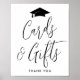 Sinal de festa de formatura moderno com ilustração de um boné de formatura preto no topo com "Cartões e presentes" exibido em um script de caligrafia preta. Personalize o simples poster de graduação com seu texto personalizado na parte inferior (mostrado atualmente com "Obrigado"). O sinal de festa de formatura é perfeito para formandos segundos graus e universitários.