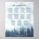 Este elegante quadro de assentos de casamento tem atribuições de mesa para 110 convidados em 11 mesas (10 pessoas por mesa). A design é rústica, mas elegante, apresentando uma cena de montanha em floresta com um morro coberto por uma suave floresta de pinheiros azuis. O título diz "por favor, encontre sua mesa" na caligrafia de scripts antigos. Há espaço para os nomes do casal e da data do casamento.