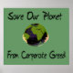 O planeta Terra está amável em um par de mãos com as palavras "Salve nosso planeta da ganância corporativa." Sem a nossa ajuda, o planeta será destruído pelas alterações climáticas e pelo aquecimento global provocados pelo egoísmo da ganância empresarial.
