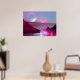 Uma renderização colorida em 3d de um pôr do sol e de um planeta que parece ser cristal ou o que quer que pareça para você, com rochas coloridas em um mar de lavanda.