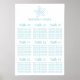 Simples desenho em branco e azul de uma lista de assentos de estrelas/mar. Ideal para ajudar seus convidados a encontrar seu lugar no seu casamento. Edite este gráfico de mesas de assentos de casamento com seus próprios assentos e nomes de convidados. A design de casamento do estilo moderno estilo praia fascinável, parte do conjunto de papéis de carta de casamento de estrelas-do-mar. Design e desenho de Sarah Trett.