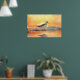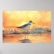 Vivid watercolor illustration of a bird standing on a sandy beach, with gentle ocean waves and glowing sunset hues creating a tranquil and painterly atmosphere.