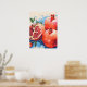 Um retrato artístico espantoso de romãs maduros e lúcidos que explodem com ricas sementes vermelhas. O vibrante contraste entre os vermelhos profundos e o fundo azul legal cria uma composição ousada e refrescante. Esta peça incorpora abundância, vitalidade e a beleza da natureza — perfeita para amantes de comidas, decoração de cozinha, ou qualquer pessoa que aprecie ilustrações de fruta artística.