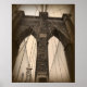Imagem de efeito fotográfico de estilo Vintage da ponte brooklyn em Nova Iorque, EUA. Tonalidades castanhas escuras e sépias com vista de dentro da ponte, olhando para cima para a estrutura de tijolos e fios. Todos os Designs Copyright © 2012 www.CuteComfy.com
