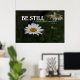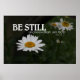 Poster com o verso do Salmo 46 que diz "Fique quieto e saiba que sou Deus" contra o fundo de uma fotografia de margaridas brancas com centros ouros amarelos encoraja os espectadores a abrandar e considerar o lado espiritual de suas vidas.