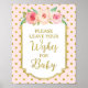 Deseja um poster de sinal de bebê para chá de fraldas em padrões cor-de-rosa claro e dourado com borda dourada, flores rosadas rústicas e aquarelas de pêssego e letras de estilo manuscritas.