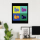 Uma imagem do esquilo fotoomanipulada num estilo de pop art em azul, verde, amarelo, laranja, turquesa e roxo contra fundo preto num poster