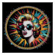 Uma vibrante design de pop de arte apresenta uma mulher retrorada vestindo ógrados óculos de sol, cercada por uma explosão de linhagens coloridas. O uso ousado de ciano, magenta e amarelo cria uma composição dinâmica e energética.