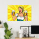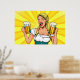 Fun Oktobefest or Beer fest event with pop art style woman winking. She wearing a traditional dirndl and holding two beers in mugs.