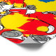 A woman with stylish sunglasses gazes thoughtfully. The background is vivid and filled with dynamic comic book-like elements in bright colors.