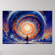 Trabalho de arte de uma figura solitária em frente a um vórtice portal. Um vórtice brilhante, girando domina a cena, pulsando com energia e cor, enquanto um observador solitário se silhueta contra a luz. Os ricos blues e púrpura da paisagem contrastam com o coração feroz do portal, criando uma atmosfera de mistério e antecipação. Uma peça evocativa que desperta a imaginação. Uma figura solitária proporciona um sentido de escala humana contra o fenômeno cósmico esmagador. A composição dinâmica e as cores vibrantes fazem disso um ponto focal impressionante, perfeito para adicionar um toque do extraordinário à decoração da sua casa. Este trabalho de arte pode ser personalizado, impresso e ou baixado.