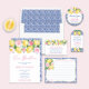 Limões de aquarela e flores bonito contra um fundo de azulejo azul e branco de cobalto para este símbolo de na moda ou de boas-vindas do Chá de fraldas.
