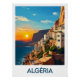 Illustration of Algeria showing a white cliffside town by the Mediterranean Sea, bathed in a glowing sunset. A bright and warm poster for oriental-style wall decoration.