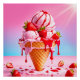 Uma mesa cor-de-rosa suave, com um fundo gradiente misturando rosa, azul e roxo, cria uma atmosfera doce, intensa, mas úmida. A luz suave de cima à direita captura delicadamente o sorvete de fusão, destacando sua transformação suave. O cone de waffle fica em pé na mesa, tocado com generosas colheres de sorvete de morango, arredondada e transbordando. Entre as colheres estão três morangos frescos, adicionando um toque de frescura ao local. O xarope de morango vermelho é gotejado sobre o sorvete e a luz do sol faz com que ele funda levemente, com piscinas de xarope e sorvete formando-se na mesa abaixo. Morangos frescos, três inteiros e dois com metade, adicionam um toque vivo à cena. As pessoas podem não gostar quando o sorvete derrete no verão, mas imagino muitas vezes tornar-se como o sorvete, suavemente derretendo sob o sol. A sensação reconfortante e úmida que vem quando a tensão derrete no meu corpo traz um sentimento de relaxamento que eu não trocaria por nada.