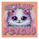 Um gatinho fofo com olhos brilhantes é adormecido com flores cor-de-rosa, cercado pela frase "Cute but Psycho" em letras cor-de-rosa. Corações e estrelas acentuam a design lúdica, mas pesada.