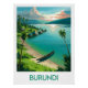 Treat yourself to a peaceful escape on Lake Tanganyika with this Burundi poster. A calm sunset, overwater huts, and a wooden canoe on the shore create perfect tropical and soothing wall art.