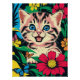 Um gatinho fofo de olhos azuis brinca na natureza com flores e borboletas em Estilo de Pintura Pop Art.