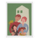 poster van familie, ouders, twee kinderen en een poes, met silhouet van huis op de achtergrond. kleuren groene en rode tinten.