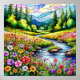 Prado colorido mostrando uma variedade de flores silvestres e um riacho suave fluindo através dele, cercado por árvores e montanhas. Captura a beleza vibrante da natureza, serenidade e tranquilidade.
