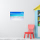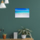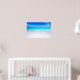 Um poster com uma praia tropical arenosa. Um belo mar de turquesa à distância e águas cristalinas acariciando uma praia arenosa. Um céu azul brilhante no fundo.
