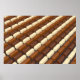 Muitas filas com pralas escuras, brancas e de chocolate de leite