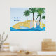 Pranchas de surfe numa praia tropical com palmeiras de poster, com paisagem tropical. Há palmeiras e pranchas na areia e ondas azuis. É um modelo e você pode adicionar seu texto ou personalizá-lo para alterar a imagem, o texto, a fonte, a cor. Esquema de cores: azul, verde, branco, amarelo, tan
