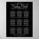 Torne a sua recepção de casamento bonita com este gráfico de 9 mesas. Projetado como parte de nossa suíte de casamento elegante de folha prateada, ele apresenta um simples mas elegante design com texto de cinza prateada pálida em um fundo preto com uma borda floral de folha de papel prateada. Este gráfico mostra atribuições de mesa para 90 convidados.