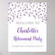 Poster de festa de aposentadoria de texto personalizado com confete prateado e roxo.