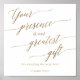 Esta elegante caligrafia de ouro... sua presença é nossa maior poster de presente... é perfeita para um casamento simples. A design neutra apresenta uma carta minimalista decorada com a tipografia falsa de ouro romântica e caprichosa. Nota: Este design não apresenta folha de ouro real. É um gráfico de alta qualidade feito para se parecer com folhas de ouro.