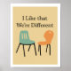 "Gosto que sejamos diferentes" com dois estilos diferentes de cadeiras retrorreflectoras modernas do século médio. É uma declaração sobre seu estilo decorativo? Ou talvez o seu estilo de relacionamento? Retro divertido olha com cores modernas do meio século. Parece excelente num quadro negro moderno. Trabalho de arte copyright 2015 Visuaria Publishing.