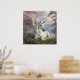 A sweet magical fairytale themed poster wall art. A pretty unicorn with a gold horn and eyes sitting under a rainbow near a castle.