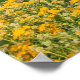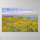 Um campo vibrante de flores silvestres amarelas se estende em direção ao horizonte, criando um impressionante contraste contra o oceano azul e o céu nublado na Península de Monterey, Califórnia. As flores estão em flor de cheio, suas pétalas amarelas brilhantes criando um mar de cor. O litoral é visível ao fundo, com recortes rochosos e as leves ondas do oceano.