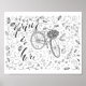 Primavera está aqui uma ilustração vetorial com uma bicicleta vintage, cheio cesto de flores, letras de caligrafia e rabiscos fedorentos. Poster de tipografia do vetor preto e branco em design de linha linear de tinta.