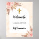 Ouro, impressão de mármore colorido de pêssego como fundo decorado com uma cruz de ouro, grama-pampas e flores cor-de-rosa escamoteadas e um quadro em forma de arco branco. Personalize e adicione um nome.