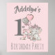Poster de primeiro aniversario de festas de elefante de menina bonita a rosa e cinza. Este adorável elefante princesa tem um presente de aniversário embrulhado e um monte de balões cor-de-rosa e prateados e está sentado ao lado de um número 1 personalizável. Entre em contato conosco para obter ajuda com a personalização ou para solicitar produtos correspondentes.