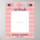 Torne o primeiro dia de fotos da escola do seu filho ainda mais memorável com nosso divertido, colorido e único primeiro dia de cartaz fotográfico da escola para que seu filho guarde no primeiro dia de fotos da escola. O design apresenta uma seção de recorte branca para você se destacar para criar este design de quadro super legal que seu filho pode segurar na frente do rosto. Fundo de stripe cor-de-rosa divertido com tipografia multicolorido e design de tipografia personalizada para o nome, a qualidade e a data do seu filho.
