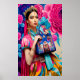 Imagem de uma princesa floral de moda com bolsa, cinta de ouro, joias e coroa.