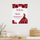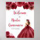 Esta placa de boas-vindas de Quinceanera apresenta uma bela princesa num vestido vermelho de burgundy com arranjos florais. Isto é perfeito para uma festa de aniversário de Quinceanera.