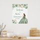 Este sinal de boas-vindas da Quinceanera apresenta uma bela princesa num vestido verde sábio com arranjos florais. Isto é perfeito para uma festa de aniversário de Quinceanera.