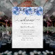 Um programa de casamento moderno e elegante, linha do tempo. Fundo de aspecto fino prateado decorado com faíscas e flores azuis. Personalize e adicione seus nomes e detalhes do casamento. Letras pretas coloridas. Se você tiver mais texto, é possível reduzir o espaço na linha.