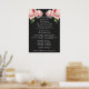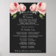 Cartaz de programa de casamento com uma ilustração vintage de flores rosa e folhagens em um fundo cinza.