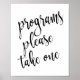Um elegante sinal de casamento de ponta, apresenta o texto "programas por favor pegue um" em uma fonte de letra cursiva extrovertida, a textura da pincelada adiciona um sentimento espontâneo e divertido. A cor do fundo pode ser personalizada de acordo com suas necessidades e preferências, por favor entre em contato se tiver algum pedido especial.