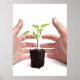 Duas mãos protegem uma planta jovem que cresce a partir de um pedaço de solo