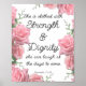 Provérbios 31:25. Ela está vestida com força e dignidade, pode rir-se dos dias que se avizinham. Verso está rodeado de rosas cor-de-rosa.