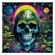 A.I.A. O impressão criado de um crânio multicolorido vibrante está rodeado por folhas verdes esmagadoras, criando um contraste impressionante entre elementos naturais e imagens psicodélicas e surreais.