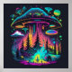 Uma cena de acampamento de OVNI neon no céu noturno.