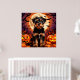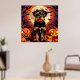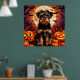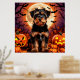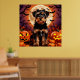 Um filhote fofo e fofo está cercado por abóboras esculpidas sob luz de lua brilhante no outono, com uma atmosfera festiva de Halloween, com morcegos e um misterioso pano de fundo florestal.