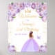 Esta elegante e glamourosa placa de boas-vindas festas de aniversário apresenta uma bela princesa com cabelo castanho num vestido de bola roxo e claro. O texto combina o script manuscrito e as fontes sans serif modernas para um aspecto elegante e sofisticado. Os arranjos florais, borboletas e confete de ouro criam a mistura perfeita de rústicos e quicos. Gráficos por www.etsy.com/uk/shop/SunflowerDayLove